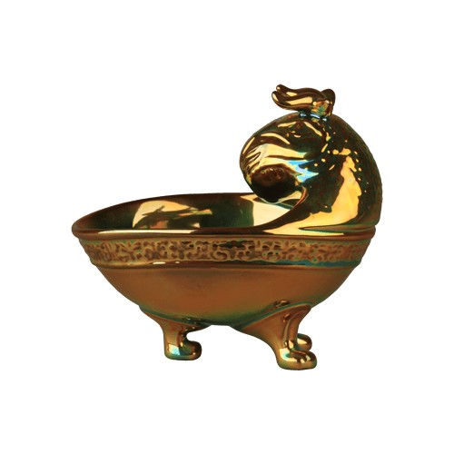 A nagyszentmiklósi aranykincsek egyik legszebb darabja: a bikafejes ivócsanak alapján készült porcelán tárgy, zöld eozin mázzal.